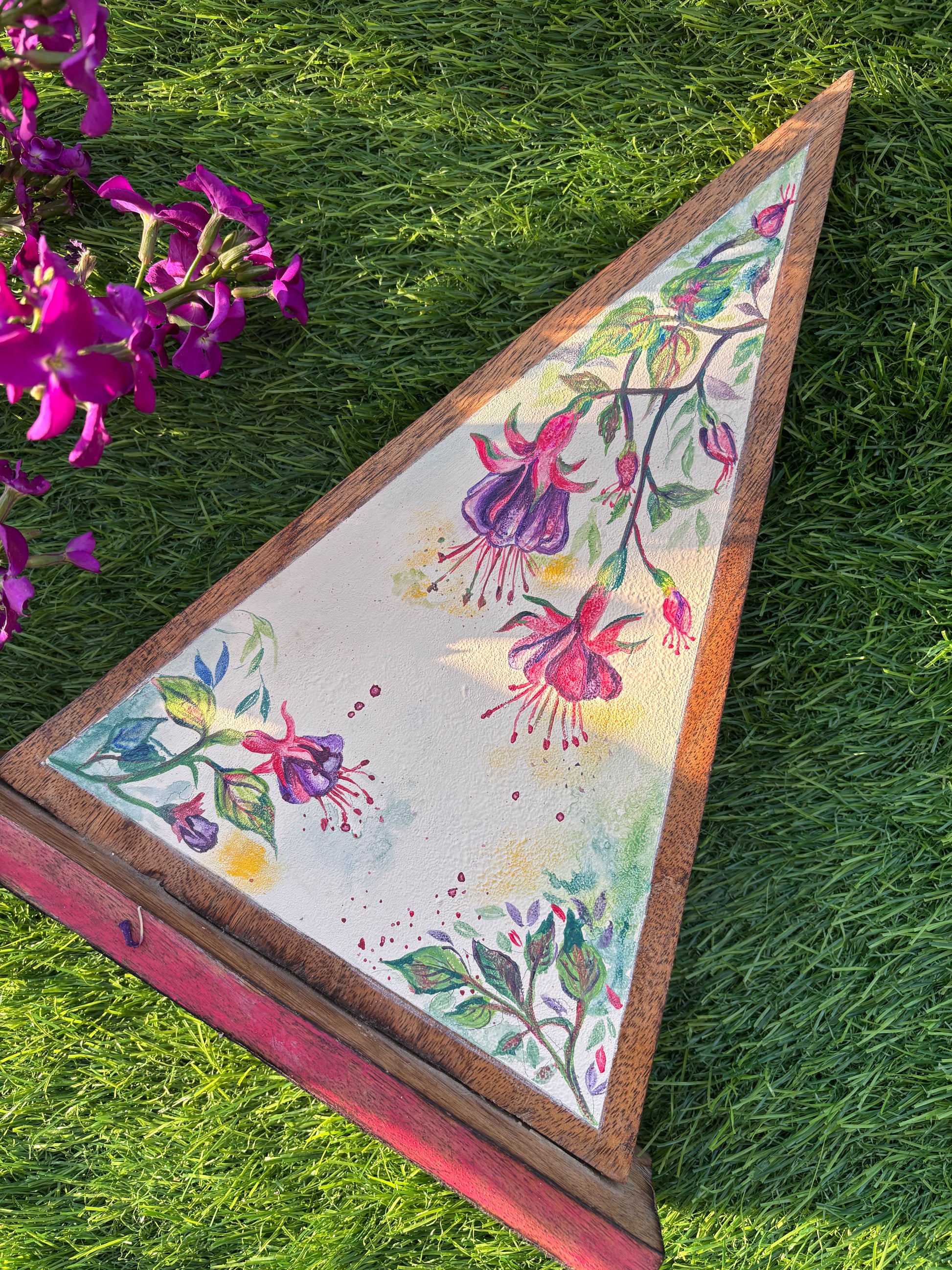 Celebrate the charm of wildflowers and folk art with this unique hand-painted triangular wall piece. Crafted on solid wood and adorned with delicate fuchsia blooms, this art piece is perfect for those who love nature-inspired, one-of-a-kind dΓ©cor. Let your walls bloom with character, creativity, and cottage-core magic.