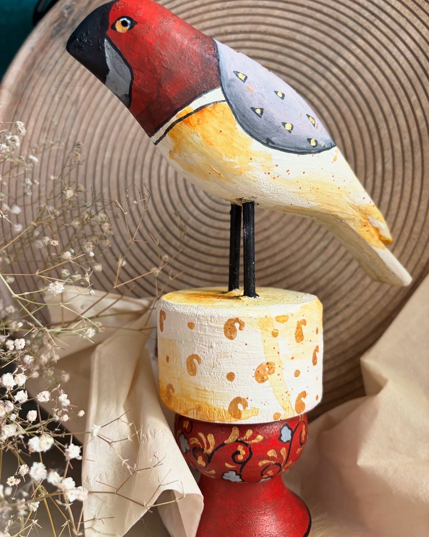Bring a rustic charm to your home with the Rustic Finch, a hand-carved wooden bird inspired by the beauty of wild finches. This intricately painted decor piece features warm earthy tones with detailed brushstrokes, creating a lifelike appearance. The striking red and black head is contrasted with a muted cream body, enhanced with soft golden speckles.